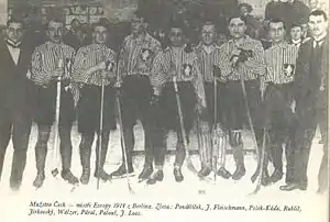 ![]() Збірна Богемії на чемпіонаті Європи 1914 року. Карел Пешек третій зліва. | ||||
