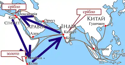 Купці-посередники отримували прибуток від кожної операції перепродажу, а постійний приток срібла, потрібний для такої торгівлі, забезпечували європейські споживачі, готові купувати прянощі за будь-яку ціну. Ще одним джерелом дорогоцінного металу був Китай — який перетворився на вершину іншого «торгівельного трикутника»[3].