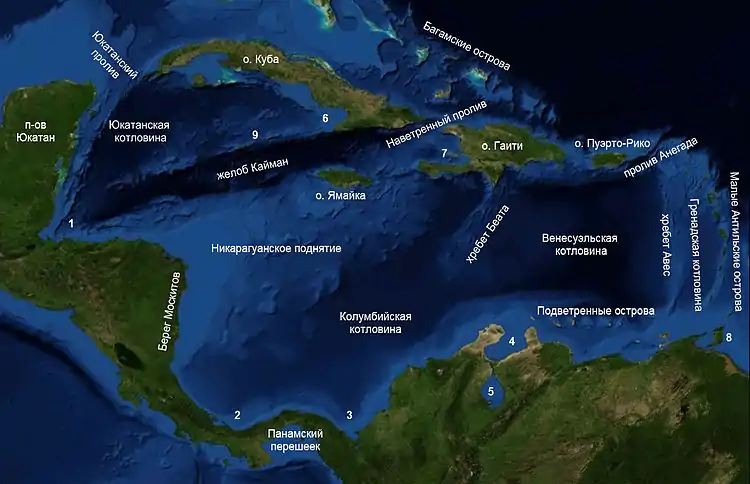 | Цифрами позначені: 1. Гондураська затока 2. затока Москітос 3. Дар'єнська затока 4. Венесуельська затока 5. озеро Маракайбо 6. Гуаканаябо 7. затока Гонав 8. острів Тринідад 9. Кайманові острови |