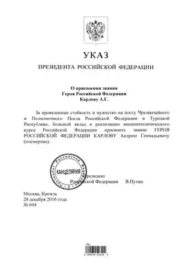 - Андрію Карлову присвоєно звання Героя Російської Федерації. Kremlin.ru (рос.). 21 грудня 2016. Процитовано 21 грудня 2016.