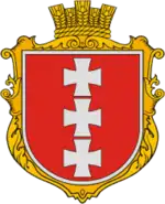 Щит напіврозтятий і перетятий; у першому червоному полі два срібні прямі хрести, один над одним, у другому лазуровому полі — два срібні жорна, одне над одним; у нижньому зеленому полі на золотій випуклій основі стоять дві срібні куріпки, одна напроти одної. Щит облямований золотим декоративним картушем і увінчаний золотою сільською короною.