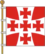 Квадратне полотнище розділене на чотири рівновеликі квадратні поля — червоне, синє, зелене та жовте; в червоному полі два білі прямі хрести, один над одним.