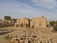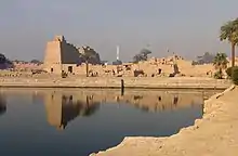 На схід від ряду дворів — священне озеро, яке слугувало для процесій барки Амона. На північ від головного храму, в особливій огорожі — третя група святилищ; головне, на честь Монту, засноване Аменхотепом III. Звідси на північ йде також алея сфінксів. Нектанеб, незважаючи на перські утиски, встиг спорудити пілон на схід від стародавнього святилища, яке, таким чином, виявилося в самому центрі будівель. Пошкодження, нанесені Артаксерксом III, були виправлені першими Птолемеями, але при останніх почалося падіння храму, остаточно завершилося землетрусом 27 р. до н. е.