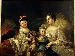 Кароліна Луїза із старшими синами, 1757 - Фрідріх (1756—1817) — був одружений з Крістіаною Луїзою Нассау-Узінґенською, нащадків не залишив;