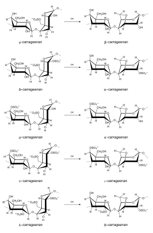 Каррагінани являють собою сімейство лінійних сульфатованих полісахаридів, які отримують з червоних морських водоростей. За хімічною природою каррагінани близькі з агароїдами.[2] Ці каррагінани добре розчинні у гарячій воді (температурою 90-95оС), а після охолодження до температури 40-45оС формують гелі.[1]