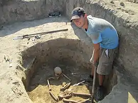 На глибині 90 см знайдено людський череп, а кістяк лежав на животі, руки зігнуті в ліктях та заведені під тулуб. Ноги зігнуті у колінах, малі гомілкові кістки укладені вліво, на південь. На уступі (120 см), в анатомічному порядку лежав скелет собаки. Тварина була укладено на правий бік, мордою на південь. У різних частинах ями, на дні під стінами виявлено собачі черепи та кістки скелета щонайменше від 6 особин. Північний сектор ями заповнений камінням. На рівні залягання кістяка й при його розбиранні траплялися характерні фрагменти столового посуду із тонкими стінками з глини із лощеною поверхнею. Однак, нижче кістяка й у придонній частині заповнення ями повністю переважають фрагменти кераміки середньогальштатського періоду — чернолощена кераміка та кухонний посуд | ||