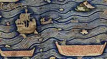 «Кораблі, що називаються джонками, які плавають у цих морях, несуть чотири або більше щогл, деякі з яких можна піднімати або опускати, і мають від 40 до 60 кают для купців і лише один румпель. Вони можуть орієнтуватися без компаса, оскільки у них є астролог, який стоїть з астролябією в руках і віддає накази штурману» (текст з карти Фра Мавро, 09-P25).