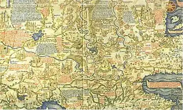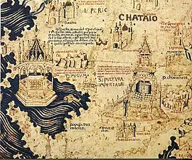 В азіатській частині карти показані Аравійський півострів, Персія, Індійський субконтинент, включаючи острів Шрі-Ланка, острови Ява і Суматра, а також Бірма, Китай та Корейський півострів. Каспійське море, яке межує з Європою, має точну форму, але обриси Південної Азії спотворені, Індія розділена на дві половини. Зображені такі великі річки, як Тигр, Інд, Ганг, Хуанхе та Янцзи. Міста включають Багдад, Пекін, Бухару та Аюттхаю.