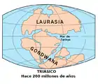 Мапа світу, що показує континенти 200 мільйонів років тому (Тріасовий період)