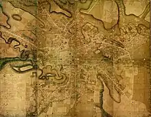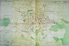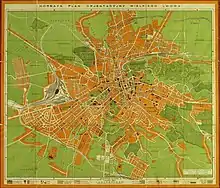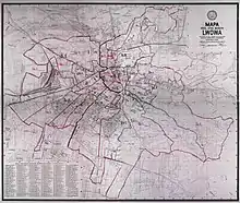 | 1917 | пол. Mapa król. stoł. miasta Lwowa wykonana w oddz. pomiar.-regulacyjnego mejskiego departamentu technicznego. Lwów w Maju 1917 / укр. Карта столичного міста Львова у мірнично-регуляційному відділі міського технічного департаменту. Львів, травень 1917 рік | Іґнацій Дрекслер, Тадеуш Толвінський; Мірнично-впорядкувальний відділ технічного департаменту магістрату м. Львова | Літографія. Одноколірна з рукописними кольоровими лініями. 105x125 см. | ![]() |