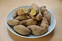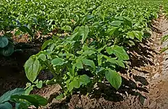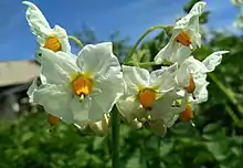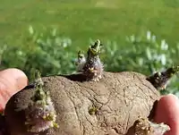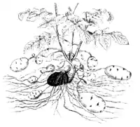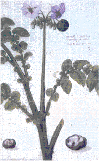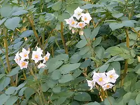 Картопля (лат. Solanum tuberosum L) — однорічна в культурі та багаторічна в дикому стані трав'яниста рослина родини пасльонових[20] (лат. Solanace L.) роду Паслін (лат. Solanum), яка об'єднує до 150 диких і культурних бульбоплідних видів. Хоча картопля — багаторічна рослина, проте її саджають щорічно навесні, оскільки бульби, залишені на зиму у ґрунті, загинуть від морозів. Основними вихідними формами європейської культурної картоплі є автотетраплоїдні бульбоносні (4x=48) підвиди ssp. tuberosum L. і ssp. andigena Hawkes, які походять з Анд Південної Америки.