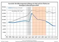 Динаміка населення з 1875 року в сучасних кордонах (Синя лінія: населення; Пунктир: відносна порівняльна динаміка населення землі Бранденбург; Сірий фон: період Третього рейху; Помаранчевий фон: період НДР)