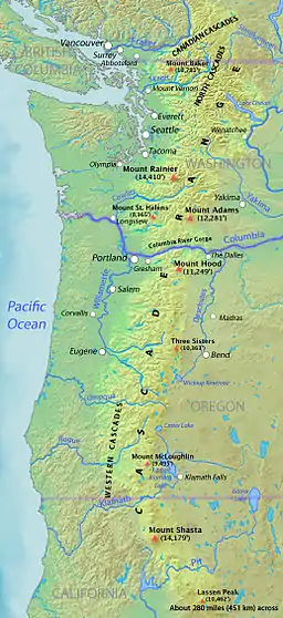 У штаті Вашингтон відомими горами є: Рейнір, Сент-Хеленс. У Орегоні головними горами є: Маунт-Худ, Сістерс, Бачелор.