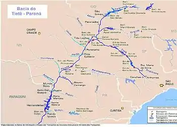Схема розташування ГЕС у верхній частині басейну Парани. Ясірета на схемі не вказана, також зазначено тільки водосховище великої ГЕС Фурнас потужністю 1,3 ГВт у верхній течії Ріу-Гранді