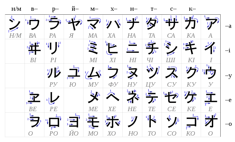 В наведеній нижче таблиці показано порядок написання штрихів кожного символу катакана. Вона впорядкована в традиційний спосіб, починаючи з верхньої правої частини і читається вниз по стовпцям. Номери і стрілки показують порядок написання штрихів і напрям цих штрихів, відповідно.