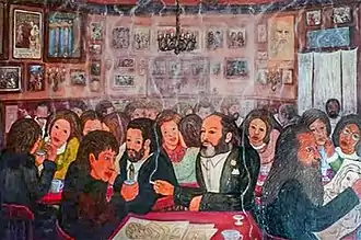 | Aigua de València ['ajγwə də βə'łɛnsiə] Валенсійська вода «А́йгуа де Вале́нсіа» | Відомий валенсійський коктейль з кави, помаранчевого соку, горілки та джину. Вперше приготований та поданий у 1959 р. у кав'ярні «Мадрид» у місті Валенсія. На малюнку — картина «Кав'ярня "Мадрид"» Кунстанте Жіла (кат. Constante Gil), винахідника «валенсійської води». | |