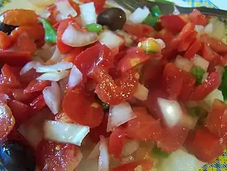 | Esqueixada [əskəˈɕaðə] Салат з тріски або «аскашяза» / «ескашада» | Один з найтрадиційніших каталонських салатів. З овочів використовуються помідори, цибуля, перець та оливки, іноді зварене яйце та квасоля. Найчастіше цей салат готується влітку. У Валенсії називається кат. esgarrat. | |