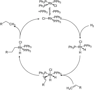 Каталізатор Вілкінсона використовується для гідрування алкенів[3][4]. На початковій стадії механізм цієї реакції включає в себе дисоціацію одного або двох лігандів трифенілфосфіну з утворенням 14-ти або 12-ти електронних комплексів відповідно, після чого відбувається окиснювальне приєднання H2 до металу. Наступне утворення π-комплексу з алкеном, внутрішньомолекулярне перенесення гідриду (вставка олефіну) та відновне елімінування призводять до утворення алканового продукту, тобто: