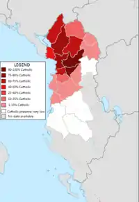 Серед здебільшого ісламського та православного населення католики складають відносну меншість на півночі країни. Католицька віра поширена серед субетносу міридітів. Центром католицтва є Шкодер. Зокрема зі Шкодеру родом був католик Васо Паша, один з лідерів албанського національного відродження XIX століття, а також чиновник Османської імперії.[2]