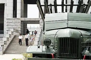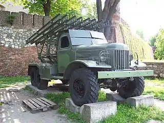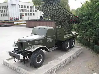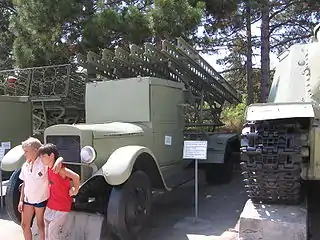 ![]() БМ-13Н на шасі Studebaker US6 (з опущеними бронеплитами захисту від вихлопу) в Центральному музеї німецько-радянської війни у Москві | |
