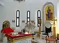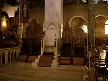 Всередині святилища Свято-Володимирського скиту (Валаамського монастиря), праворуч кафедра єпископа на високому місці (горішньому місці) з білого мармуру, з мармуровими лавками для священиків