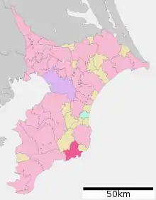 Розташоване в південно-східній частині префектури, на сході півострова Босо, на березі Тихого океану. Виникло на основі декількох сільських поселень та порту раннього нового часу. Основою економіки є сільське господарство, рибальство, туризм. Станом на 1 жовтня 2008[1] площа міста становила 94,20 км². Станом на 1 січня 2009[2] населення міста становило 21 000 осіб.