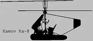 Ка-8 — перший вертоліт М. І. Камова. Ка-8 вперше піднявся в повітря 12 листопада 1947 року, представляв собою просту конструкцію із сталевих труб, укріплену на двох надувних циліндричних балонах і з відкритим кріслом для льотчика. Двигун потужністю 20 кВт (27 к. с.) обертав в протилежних напрямах два співвісних гвинта. Ця схема дозволила звільнити апарат від складнощів, які були пов'язані з компенсацією реактивного обертального моменту за допомогою хвостового гвинта. Всього побудовано 3 примірника.