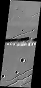 Великі розломи (довгі вузькі западини) у географічній мові, яка використовується при вивченні Марса, окреслюються терміном fossae. Цей термін походить з латинської мови, а тому fossa — це однина, а fossae — множина.[26] Розломи утворюються, коли кора планети розтягується, аж доки не руйнується в певних місцях. Розтягування може бути спричинено великою вагою вулкана поблизу. Fossae-кратери, або ерозійні кратери є досить поширеними у вулканічних системах Tharsis та Elysium.[27]