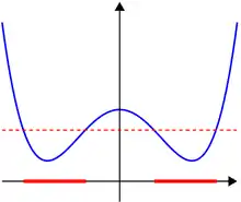 Функція, що не є квазіопуклою: множина точок, значення функції в яких не перевищує червоної пунктирної лінії не є опуклою.