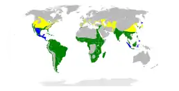 ![]() Ареал поширення виду N. nycticorax Гніздування Осіле проживання Зимування | ||||||||||||||