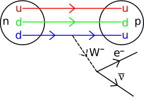 | n | → | p | + | e− | + | νe | (бета-розпад, адронний запис) |