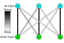 Існує також еквівалентна матриця слабких взаємодій для лептонів (PMNS матриця).[53] Разом матриці CKM і PMNS описують всі перетворення ароматів, але зв'язок між ними ще не відомий.[54]