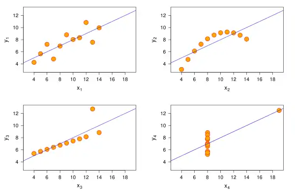 Чотири набори даних мають ідентичні статистичні характеристики, але їх графіки істотно різняться.