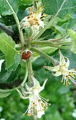 ![]() Квіткоїд яблуневий: жук (1), бутон з отвором, куди відкладене яйце (1b), личинка (1L), лялечка (1P) і бутони з личинками, що розвиваються всередині (1a). Малюнок із старовинної книги. | ||||||||||||||||||||||||||||||
