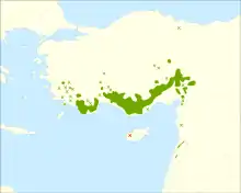 Підвиди його (що інколи розглядаються як окремі види) поширені в південно-західній Туреччині, на Кіпрі, і в Атлаських горах в Алжирі й Марокко в північно-західній Африці:
