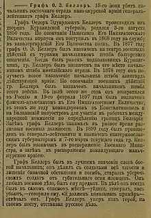 - Келлер, Федір Едуардович, граф // Военная энциклопедия : [в 18 т.] : [рос.] / под ред. В. Ф. Новицкого [и др.]. — СПб. ; [М.] : Тип. т-ва И. В. Сытина, 1911—1915. (рос.)