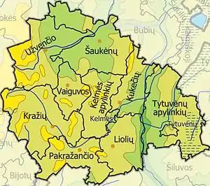 Район містить 3 міста — Кельме, Тітувенай, Ужвентіс; 6 містечок — Каркленай, Кражяй, Ліоляй, Пашіле, Шаукенай та Жалпяй; 817 сіл.
