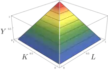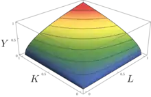 У неокласичної теорії постулюється існування однозначного (функціонального) зв'язку між задіяними у виробництві «кількостями» ресурсів (праці і капіталу) та фізичним (натурально-речовим) обсягом продукції[2]. Часто розглядається модель Солоу, в якій виробнича функція може мати вигляд