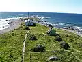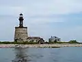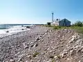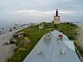 На острові знаходиться маяк, схожий на графин, заткнутий зверху пробкою: його низ являє собою зрізаний кам'яний конус висотою в 16 м, пофарбований білою фарбою, а верх — неширокий металевий циліндр темно червоного кольору з маяковим ліхтарем нагорі. Перший маяк був дерев'яною зрізаною пірамідою, що має в своїй основі восьмикутник. Фокальна площина маяка знаходиться на висоті 31 м. Дає білий спалах кожні 15 сек. Частина кам'яної основии вщент зруйнована штормом, тому для міцності споруда стягнута чотирма металевими кільцями.