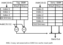 Оскільки кеш має розмір 4 КБ і лінії розміром 64 байта, у ньому зберігається 64 лінії, і ми можемо вважати за два рази з тегу SRAM, який містить 32 стовпця, кожен з яких містить кілька 21-бітних тегів. Хоча може бути використана будь-яка функція віртуальної адресації бітів 31 6, щоб індексувати тег і дані SRAM, найпростіше скористатися молодшими розрядами. Так само, тому що об'єм кешу складає 4 кБ і має четырехбайтный шлях для читання і читання проводиться за двома шляхами для кожного доступу, дані SRAM складають 512 рядів шириною 8 байтів.