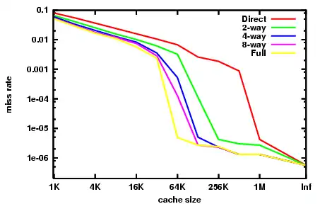 - повністю асоціативний кеш, (англ. fully associative cache) — найкращий (найнижчий) відсоток промахів (miss rate) і найкращий варіант при надзвичайно високих витратах при промаху (miss penalty).