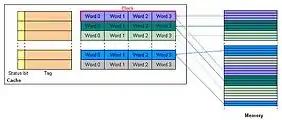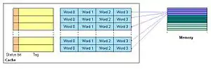 Даний розділ описує типовий кеш даних і деякі види кешу інструкцій; TLB може бути влаштований складніше, а кеш інструкцій — простіше. На діаграмі праворуч зображені основна і кеш-пам'ять. Кожен рядок — група комірок пам'яті, що містить дані, організовані в кеш-лінії. Розмір кожної кеш-лінії може розрізнятися у різних процесорах, але для більшості x86-процесорів він становить 64 байта. Розмір кеш-лінії зазвичай більше розміру даних, до якого є можливим доступ з однієї машинної команди (типові розміри від 1 до 16 байт). Кожна група даних в пам'яті розміром у 1 кеш-лінію має порядковий номер. Для основної пам'яті цей номер є адресою пам'яті з відкинутими молодшими бітами. У кеші кожної кеш-лінії додатково ставиться у відповідність тег, який є адресою продубльованих в цій кеш-лінії даних в основній пам'яті.