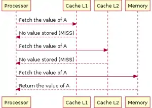Багаторівневі кеші зазвичай працюють в послідовності від менших кешей до великих. Спочатку відбувається перевірка найменшого і заразом — найшвидшого кешу першого рівня (L1), у разі попадання процесор продовжує роботу на високій швидкості. Якщо менший кеш дав промах, перевіряється наступний, трохи більший і більш повільне кеш другого рівня (L2), і так далі, поки не буде запиту до основного ОЗП.
