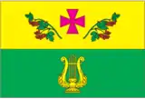 Прямокутне полотнище з співвідношенням сторін 2:3 складається з двох рівновеликих горизонтальних смуг — жовтої, на якій у центрі малиновий розширений хрест висотою 1/4 ширини прапора, обабіч якого зелені гілочки калини з червоними ягодами, та зеленої, на якій у центрі жовта ліра висотою 2/5 ширини прапора.