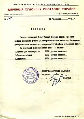 Довідка, видана Киві Галині Яківні Дирекцією Художніх Виставок України