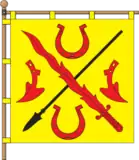 Квадратне жовте полотнище, у якому навхрест покладені червоний полум'яний меч вістрям догори і чорний спис вістрям донизу, супроводжувані угорі і знизу червоними підковами вушками доверху, по сторонам протиоберненими червоними лемехами.