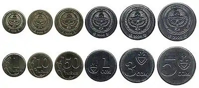 Розмінна монета, з огляду на інфляцію, вийшла з вжитку приблизно в 1998 році. На початок 2005 року в обігу знаходились банкноти 1, 5, 10, 20, 50, 100, 200, 500 та 1000 сомів випусків 1997, 2000, 2002, 2004 років (банкноти зразку попередніх років вилучені з обігу).