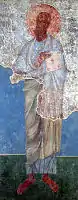 Живопис жертовника, або ж північної апсиди Кирилівської церкви, репрезентує сюжети, котрі не мають аналогів у тодішньому монументальному живопису. Усього на стінах апсиди зображено образи 25 балканських святителів, більшість яких збереглись у храмі. Поряд з деякими святими читаються імена. Тут зображено образи Кирила та Мефодія, Климента Охридського, Іоанна Македонського, Йосифа Солунського, Єфима Єврена, Артемія, Власія, Стефана. У древньому монументальному живопису, що випадково зберігся до нашого часу, у такій кількості й такому складі ці святителі більше ніде не зустрічаються. На стінах собору з XII ст. до нашого часу збереглося п'ять фрескових зображень святих вояків. Одне з них відрізняється оригінальним трактуванням. Ця фреска виконана на пілоні центрального північного стовпа, у другому регістрі. Напис, який повинен був супроводжувати зображення, на жаль, не зберігся. Образ має німб. У святого — густе волосся, великі очі, великий ніс; на плечах плащ-корзно з великою фібулою, а також довга кольчуга, одягнута наверх сорочки; руки воїна спираються на великий щит.