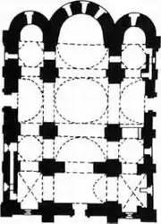У плані церква являє собою прямокутник, витягнутий за віссю «захід-схід», її розміри — 31×18,4 м. Хрещатими стовпами храм розділено на три поздовжніх (нефи) і три поперечних коридори. Поздовжні нефи завершуються на сході вівтарними апсидами. Центральний неф і головний поперечний коридор (трансепт) утворюють у перетині просторовий хрест. Над центром перетину хреста розміщується купол. Розмір підкупольного простору: 7×7,7 м. Між західною парою стовпів знаходиться стіна з широкою аркою, що веде із наосу до нартексу. Центральну частину нартексу перекрито коробовим склепінням, бічні частини — хрестовими склепіннями. Археологічні розкопки виявили, що у південній частині нартексу розміщувалися хрещальня з невеликою апсидою, від якої вціліли лише фрагменти. У стінах нартексу розташовано чотири аркосолія. На хори веде вузький хід у північній стіні, товщина якої 1, 98 м. Хори розміщуються над нартексом і західними осередками бічних нефів. У південному виступі хорів знаходиться князівська молитовня, що має вигляд невеликого ізольованого приміщення з апсидою. Лопатки стовпів на хорах декоровані напівколонками. У центральну частину церкви хори відкриваються арками. У стіні південної апсиди існує хід. Його сходи вели до невеликого приміщення з арочним отвором, відкритим у бік вівтаря.