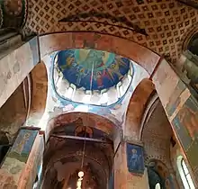 На центральних підпружках арки в круглих та квадратних медальйонах зображено сорок Севастійських мучеників, які, ніби стовпи християнської віри, підтримують барабан купола — символ небесної сфери. У центральній апсиді — фігура Богоматері Оранти з молитовно піднятими руками. Більша частина фігури — олійний живопис XIX ст, від фрескового зображення зберігся край блакитного хітону та подіум, на якому вона стоїть. Під Орантою розміщена фрескова композиція «Євхаристія» — сцени причащання апостолів.